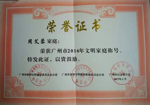 华南植物园周艾蓉家庭荣获“广州市2016年文明家庭”荣誉称号