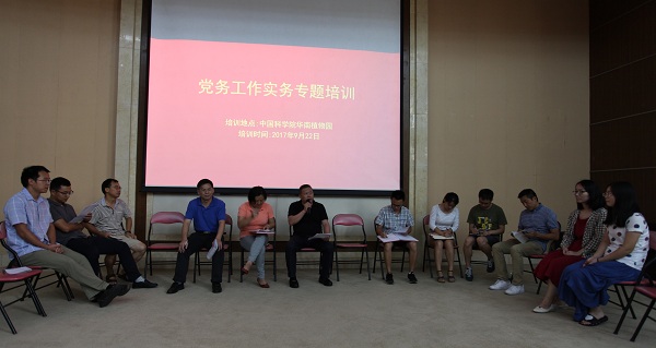 专题学习会后还进行了党务干部培训。园党委办主任范德权作了题为《发挥党员模范带头作用的思考》的报告,随后,园各支部支委等党务干部以“我在团队中的位置”为主题,组建临时党支部,模拟开展党支部专题学习会,围绕主题开展学习讨论。广州分院南海海洋研究所、地化所、能源所、生物院、广州化学公司等单位党务干部现场观摩了植物园党支部模拟专题学习会,地化所、能源所、广州化学公司党委领导对学习会进行了精彩点评。张福生总结讲话指出,模拟专题讨论会达到了教育培训党务干部围绕主题,开展支部学习活动的目的,各支部要在实际工作中,创造性地开展支部活动,把工作抓实。他强调,“我在团队中的位置”这个学习讨论主题,看似围绕个人角色,谈认识;实则要树立团队意识,谈个人作用。每个党员不但要认识自身在团队中的位置,也要明白团队其他人在团队中的位置,树立团队观念。要自觉站好位,不缺位,不越位,还要时刻注意相互补位,发挥好团队的战斗力。每位党员在任何岗位都要发挥先锋带头作用。他要求党员干部在“两学一做”学习实践中要加强政治学习,提高政治意识,结合中科院“率先行动计划”,在提升能力的基础上,勇于实践,为华南植物园“一三五”规划顺利实施贡献自己的力量。