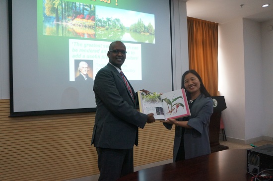 交流会上,余艳详细介绍了华南植物园的历史沿革、研究领域、科研成果、国际合作等方面情况。随后,余艳向客人介绍华南植物园参会科研人员,表示他们都曾访问过肯尼亚,并就未来希望合作的领域与代表团进行了交流。穆哈默德?胡赛因?阿布迪勒对与华南植物园的合作充满了期待,希望双方在药用植物、环境保护、植被恢复等很多领域可以开展合作。穆哈默德表示,将尽快推进华南植物园与肯尼亚Jaramogi大学、Maasaimara大学的协议签署。最后,余艳向代表团赠送了华南植物园的植物专著。