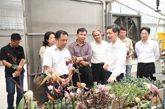 蔡澍一行首先调研了华南植物园珍稀植物繁育实验基地,听取曾宋君研究员介绍了兜兰、朱顶红以及石斛新品种的培育及产业化情况。随后,调研了华南植物园的展览温室群,任海介绍了温室的园林景观布局、植物配置及养护、科普设施投入等情况,重点介绍了华南植物园近年来在迁地保护国家重点保护植物、经济植物利用、科研成果产业化、以及为地方生态建设提供科技支撑等情况。