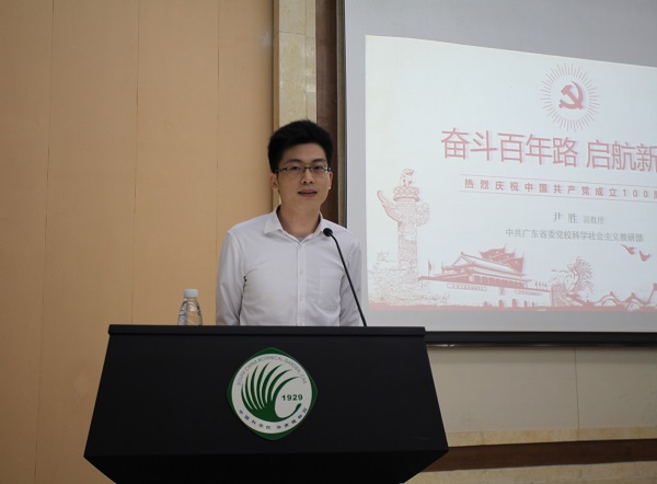 中共广东省委党校科学社会主义教研部副教授尹胜作《奋斗百年路 启航新征程——热烈庆祝中国共产党成立100周年》的专题辅导报告。该报告从学习党史的意义入手,就党史学习教育的6方面重点内容进行了深入阐述,解读了“为什么要在全党开展党史学习教育?”,即“为什么要学?”;党史学习教育的重点内容,即“学什么?”。报告从百年党史发展脉络、新民主主义革命、社会主义革命和建设、改革开放和社会主义现代化建设,系统回顾了中国共产党百年奋斗史,全面解读了中国共产党百年光辉历程中的重要时间节点和重大历史事件。报告获得参会党员广泛好评,对学习党史、新中国史、改革开放史、社会主义发展史有重要的启发。