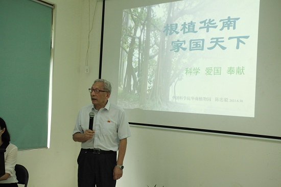 陈广浩在讲话中表示,基地的建成及揭牌是广州分院和华南植物园以实际行动献礼建党100周年的一项重要党建成果,也是深入开展党史学习教育,开展“传承老科学家精神,弘扬新时代科学家精神在行动”专项工作的具体表现,该基地是在广州分院建立的第三个党员主题教育基地,它的建成将为广州分院党员教育开辟一个全新的阵地。陈广浩指出,要提高政治站位,充分利用基地红色资源,推动党史学习教育深入开展,凝聚科技报国的强大动力;要强化“根植华南·家国天下”基地特色,展示广州分院科技工作者自觉践行爱国奋斗精神,时刻牢记“国家队”“国家人”,心系“国家事”、肩扛“国家责”;要强化基地政治功能,把基地打造成为团结引领科技人员的长效载体;要弘扬科学家精神,不断强化“创新科技、服务国家、造福人民”的科技价值观教育。