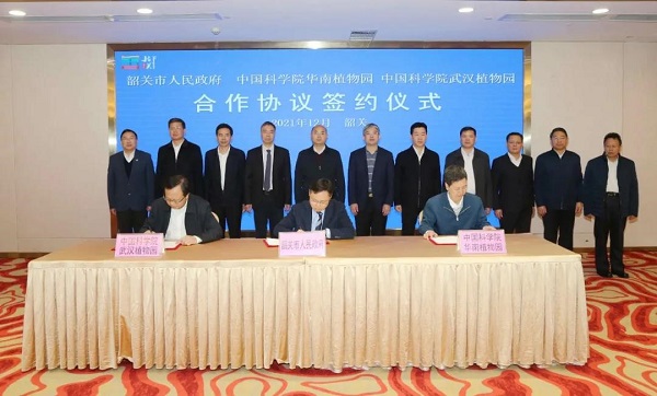 揭牌仪式上,韶关市人民政府、中国科学院华南植物园、中国科学院武汉植物园共同签订了南岭生态系统与生物多样性研究院(韶关)和岭南(韶关)植物园三方合作协议。