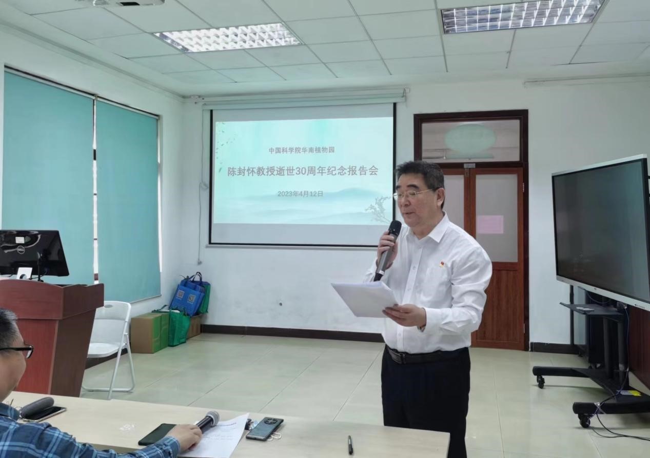为深入学习宣传贯彻党的二十大精神,开展学习贯彻习近平新时代中国特色社会主义思想主题教育,推进“传承老科学家精神 弘扬新时代科学家精神在行动”专项工作,4月12日,华南植物园举办陈封怀教授逝世三十周年纪念报告会暨传承老科学家精神主题党日。党委书记/副主任魏平、副主任叶清、党委副书记/纪委书记徐海、陈封怀之子陈贻竹、学生代表,以及党员、职工、研究生90余人参加。徐海主持会议。