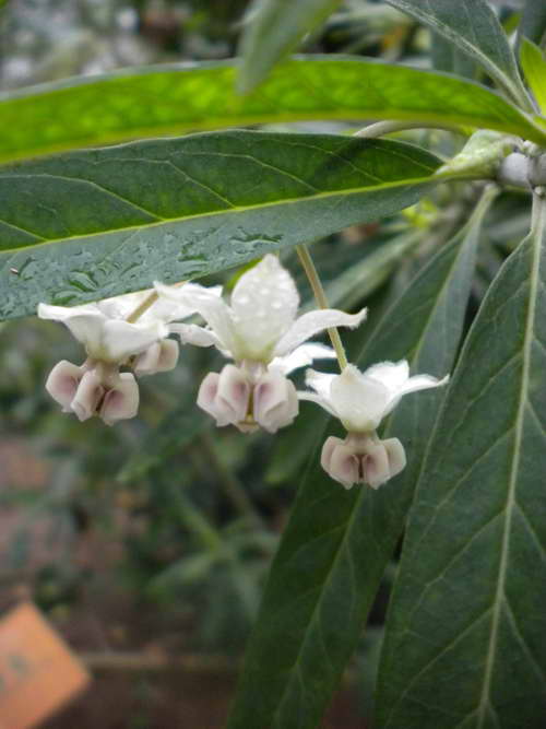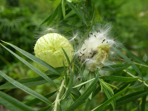 气球果(Asclepias fruticosa L.),萝摩科(Asclepiadaceae)亚灌木,高达1.8m。叶片线形,较尖,形似柳叶,表面光滑,叶色浓绿,背面稍淡。花白色至淡黄色,花期极长,每年从秋开到初春。果实黄绿色,卵圆形、圆鼓鼓的,既像是充足了气的气球,又像是正在生气的河豚,所以就有了气球果和河豚果的美称,非常奇特。果内除种子外,中空无果肉,用手轻轻一捏即扁,稍后又复原,很像气球。果实成熟后能自行爆裂,种子上部附生银白色绒毛,形似降落伞,风吹即飘到各处播种,故又名风船唐棉。