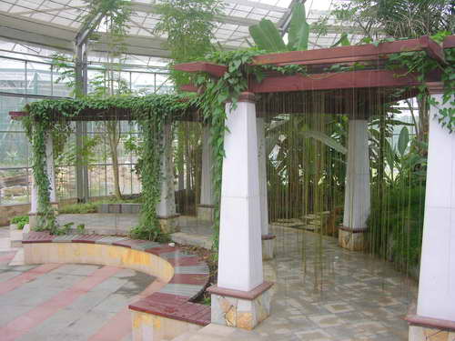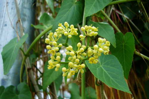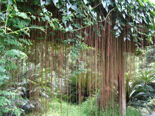 眼前的这“一帘幽梦”,是否会让你想到剪不断、理还乱的情丝?这种植物叫锦屏藤(Cissus sicyoides L.),葡萄科(Vitaceae )多年生常绿藤蔓性植物,又名珠帘藤,原产于热带美洲。其枝条纤细,有卷须,叶心形。夏、秋季开淡绿色的花,7-8月结果。锦屏藤最特别的是它从茎节处长出的红褐色的细长气根,悬垂于棚架下,当微风徐徐吹来,气根随风摇曳,仿佛隐藏着“一帘幽梦”,极富诗情画意!气根努力寻找着水和土,不断延伸,直至扎入泥土中吸收养分,使叶更绿、花更美,整株植物根深叶茂,生生不息!