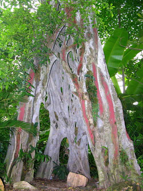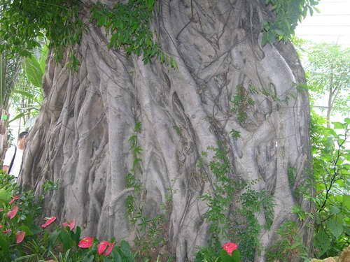 下面图片中左边的斜叶榕(Ficus tinctoria subsp. Gibbosa)和右边的垂榕(Ficus benjamina)粗大的枝干合抱共生,相互愈合而形成了连理树。斜叶榕枝条硬直,叶大,叶柄粗壮,叶片近菱形,通常两侧不等长;垂榕枝条软细下垂,叶小而密生;两种不同的榕树交织合生在一起,长出两种形状完全不同的枝叶,你中有我,我中有你,历尽无数沧桑,枝繁叶茂,共同形成一个巨大的树冠。