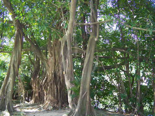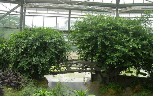 自然界唯有榕树能“独木成林”。榕环(Ficus annulata)枝条上生长的气生根向下伸入土壤形成新的树干称之为“支柱根”,有些支柱根又能长出新的枝叶成为一株新的环榕树。环榕树高达30米,可向四面无限伸展,其支柱根和枝干交织在一起,柱根相连,柱枝相托,枝叶扩展,郁郁葱葱,形似稠密的丛林,形成遮天蔽日、独木成林的奇观。(独木成林景观位于华南植物园的棕榈园、雨林温室等地)