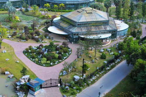 华南植物园地处花城广州的东北隅,是我国历史最悠久、收集物种最多、面积最大的南亚热带植物园,园内风光迤逦、四季常绿、热带风情浓郁,被誉为永不落幕的“万国奇树博览会”,有“中国南方绿宝石”之美誉。从高空俯瞰,园中的湖畔静谧地盛开着四朵巨大的“木棉花”,这就是被认为是广州标志性建筑之一的“世界植物温室群景区”。景区的主题理念是“植物世界”,由热带雨林温室、高山/极地温室、沙漠植物温室、奇花异果温室四个独立的钢结构玻璃温室及环绕奇花异果温室的植物水族馆组成,单体温室的造型创意源自广州市花——木棉花。四个不同主题的温室各具特色,集中向公众展示了全球植物形态各异的生态型,令观者印象深刻、叹为观止。其中尤为值得一提的是高山/极地温室,在广州这样一个南方热带城市建造高山温室,设计者可谓是匠心独具。