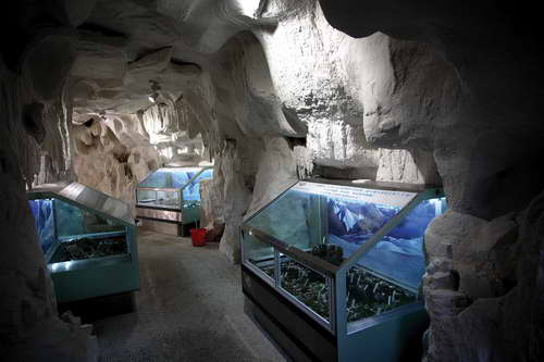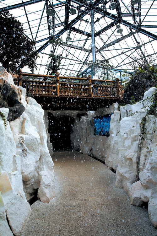 沿坡道下到隧道底部是极地植物区,主题色彩依旧是白色,隧道两面墙体和顶部全部用各种石材堆塑成雪山或冰川状,造型逼真,有些地方晶莹剔透,让人仿佛置身于雪山之巅的某处冰裂缝里。隧道的中央部位呈品字形排列着三个方形的玻璃展柜,用于保育和展示南极和北极植物,以及来自“世界第三极——青藏高原”上的冰缘植物。展柜用特制的设施来控制环境,温度控制在10℃以下,里面的有效种植面积不到2平方米,由于受空间的限制,在植物布展与造景上主要采用盆景的造景手法,利用不同风格的景石,塑造出雪山、冰川和海面浮冰等景观,各类极地植物高低错落地点缀其间,辅以各地典型代表性动物的模型和实景背景画,在灯光的配合下,模拟出极具特色的极地景观。