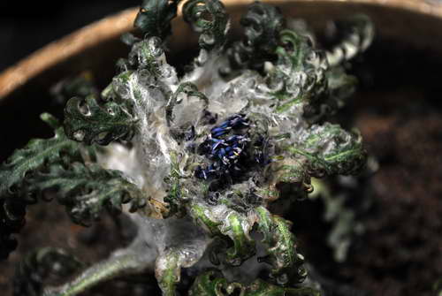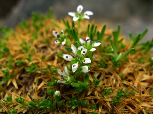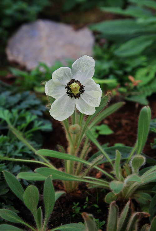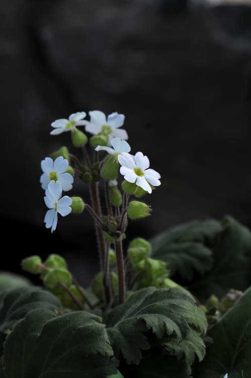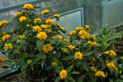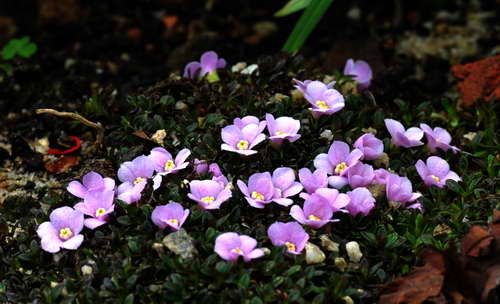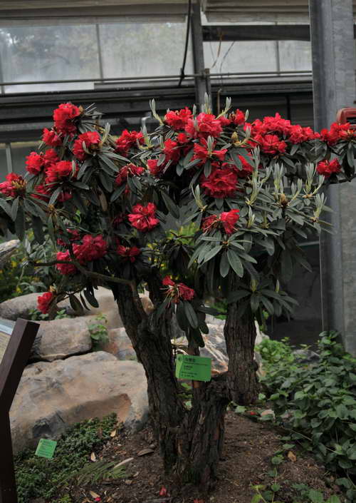 沿着盘山路拾级而上来到山体的顶端,坐落正中的是一座方形的玻璃房,这就是高山植物区,之所以采用这种房中房的形式,主要是考虑节约能源和有效控温。它的面积只有12平方米左右、高度2.5m,有独立的控温设施及补光加湿系统,将温度控制在17℃以下。景观上也是在有限的空间内采用盆景的造景手法,在馆内中间部位用景石模拟出两条蜿蜒的山脉,两侧地形塑成缓坡,其间点缀景石,配置以草本或垫状为主高山植物,营造出缩微的高山草甸和流石滩的自然生态景观。高山植物一般生长在高山林线以上、雪线以下的地带,通常分布在海拔3000m以上。因此,馆内目前收集的植物主要是来自青藏高原海拔3000-4500m之间的高山草甸或冰川流石滩,以草本为主,约有150种。