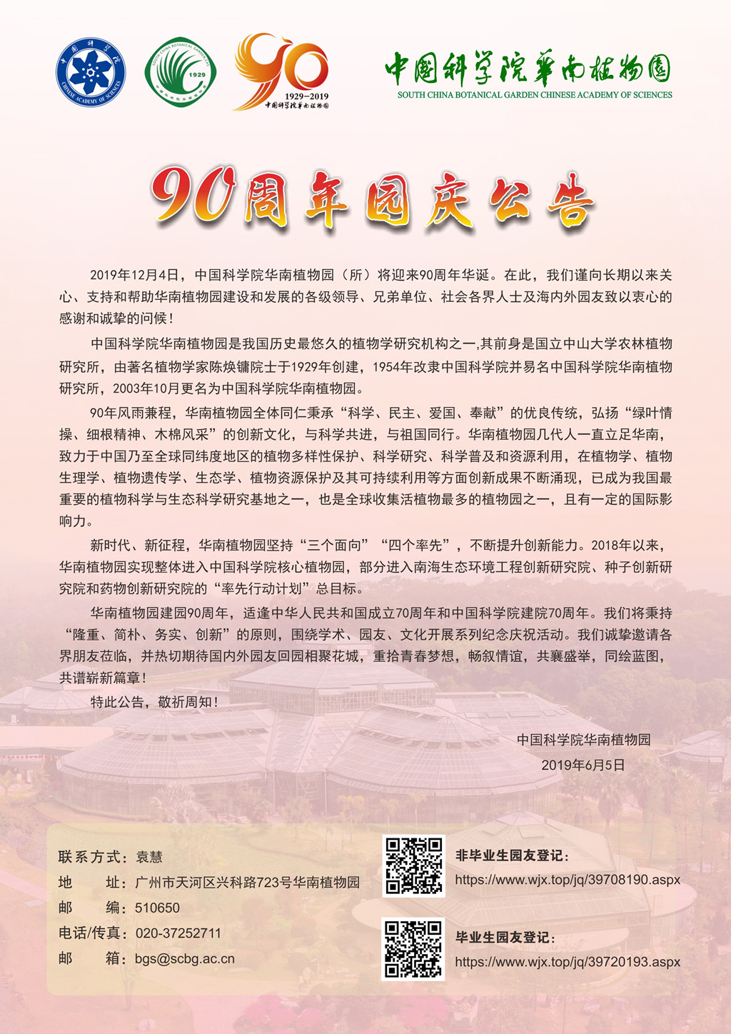 中国科学院华南植物园90周年园庆公告