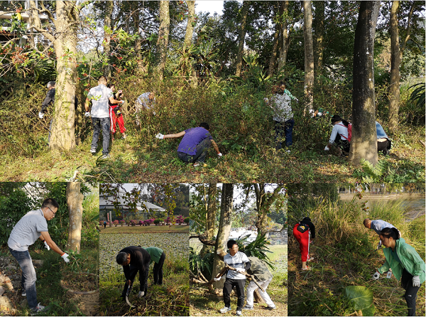 在展示区的专业技术人员的指导下,近200名党员积极参与,清除园区道路两侧杂草、衰老的枯枝和落叶,以及入侵藤本及其他乔灌木。党委书记/纪委书记张福生、园主任任海以普通党员的身份参加义务劳动。大家团结一心,齐心协力,有的拔、有的铲、有的砍、有的耙,还有的同志跳进深坑或爬到车陂涌河道陡坡边缘以斩草除根,并及时将清出的杂草及枯枝落叶全部运走。在大家的共同努力下,展示区的相关区域到彻底清理,园景园貌焕然一新。
