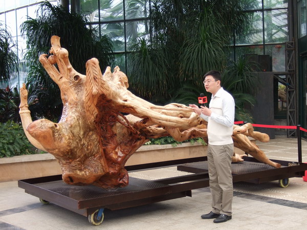 巨型万年红心榔榆木根雕来源于陕南平利县的高山峭壁。在重达两吨多的根雕上通过构思立意、艺术加工及工艺处理,将龙、凤、龟、象和八仙故事巧藉天然的贯穿于创作之中。无论是从材质、体积还是造型都堪称世界一绝,是独一无二的精品之作。