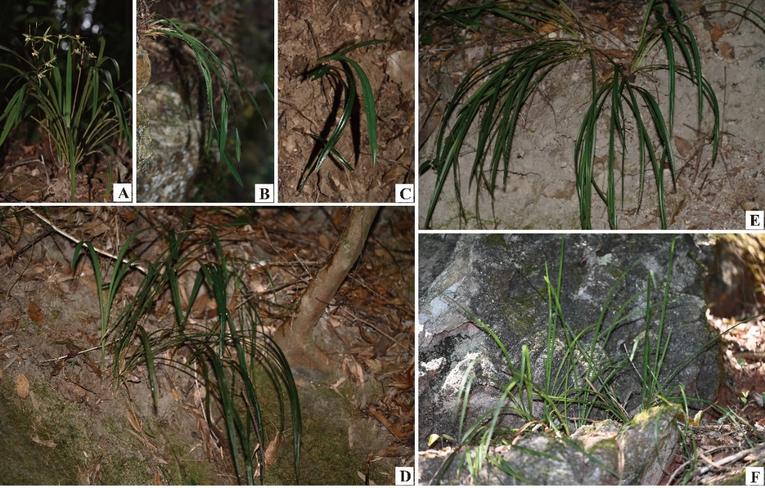 兰属植物. A: 寒兰 Cymbidium kanran, B: 多花兰Cymbidium floribundum, C: 墨兰 Cymbidium sinense, D: 莎叶兰 Cymbidium cyperifolium, E: 春兰 Cymbidium goeringii, F: 蕙兰 Cymbidium faberi.