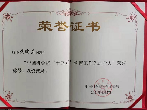 426-29日,2021年中国科学院科普培训大会在上海顺利召开。为表彰先进,激励广大科普工作者进一步做好新时代科学技术普及工作,科学院传播局评选出15家先进单位以及40名先进个人进行表彰。我园园艺中心科普旅游部副部长黄瑞兰荣获全院十三五科普工作先进个人。