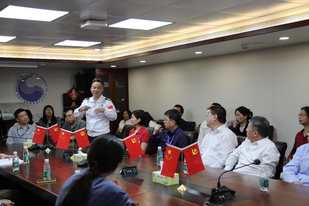 参观结束后,大家在科考船会议室观看了实验6”科考船宣传视频。徐海作《讲政治 重实效 全面提高党建工作质量》的报告,报告对华南植物园的发展历程、华南国家植物园的推进及建设情况,以及党组织发展历程、组织设置和贯彻落实中央、院党组和省委决策部署等方面的工作进行了介绍。最后,徐海回顾了2022年农生中心第一党支部与中科院南海海洋研究所热带海洋环境国家重点实验室党支部在华南植物园开展的科普专题交流会的情况,希望华南植物园和南海所能够开展更多、更深、更实的交流与合作。双方就下一步发挥各自优势,促进业务工作提升与合作进行了深入的交流和讨论。代亮对华南植物园在南海生态岛建设方面作出的积极贡献表示肯定和感谢,强调将来要进行深入的交流合作,充分发挥双方优势,紧密结合国家重大需求,为建设海洋强国贡献科技力量。