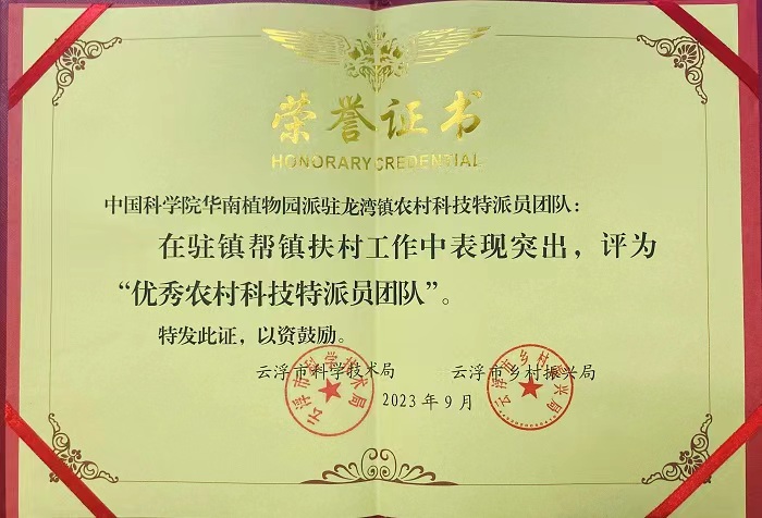 2023年9月22日,云浮市优秀农村科技特派员团队表彰会在罗定市职业技术学院举行,华南植物园优秀团队代表陈国华高级工程师在大会作了先进事迹专题发言。8月23日,广东省云浮市科技局、云浮市乡村振兴局联合发文表彰优秀农村科技特派员团队,华南植物园派驻龙湾镇的省级农村科技特派员团队荣获优秀团队称号。