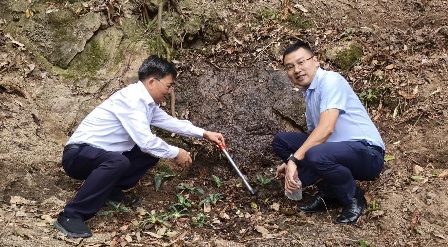 郑裕庭副县长和王俊处长在进行紫纹兜兰的野外回归