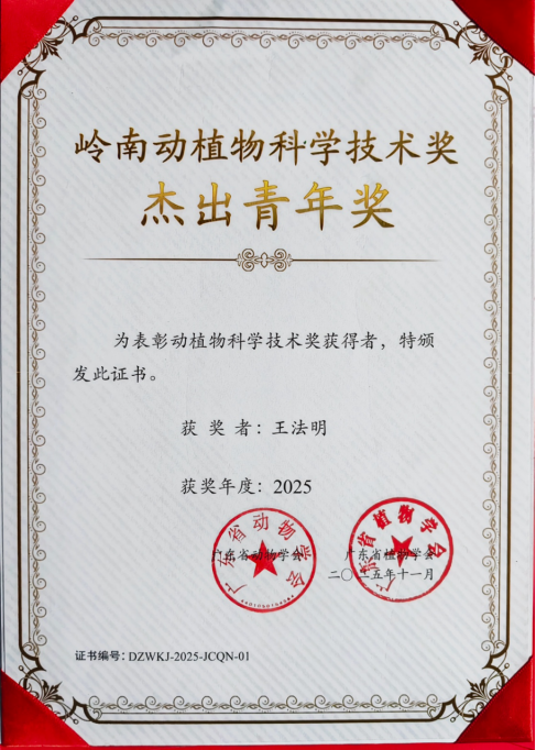11月14日获悉,2025 年度“岭南动植物科学杰出青年奖”和“长隆动植物保护奖”评选结果揭晓,中国科学院华南植物园王法明研究员和文香英正高级工程师分获殊荣。“岭南动植物科学杰出青年奖”面向动植物科学领域的优秀青年学者,旨在表彰在基础研究与应用实践方面取得突出创新成果的青年科技工作者。长隆动植物保护奖下设先进个人奖和特别奖,授予全国在野生动植物保护领域各有关部门从事保护、教育、科研、执法、科普宣传等岗位,以及社会各界支持、参与野生动植物保护事业的人士中做出重要贡献的先进个人。
