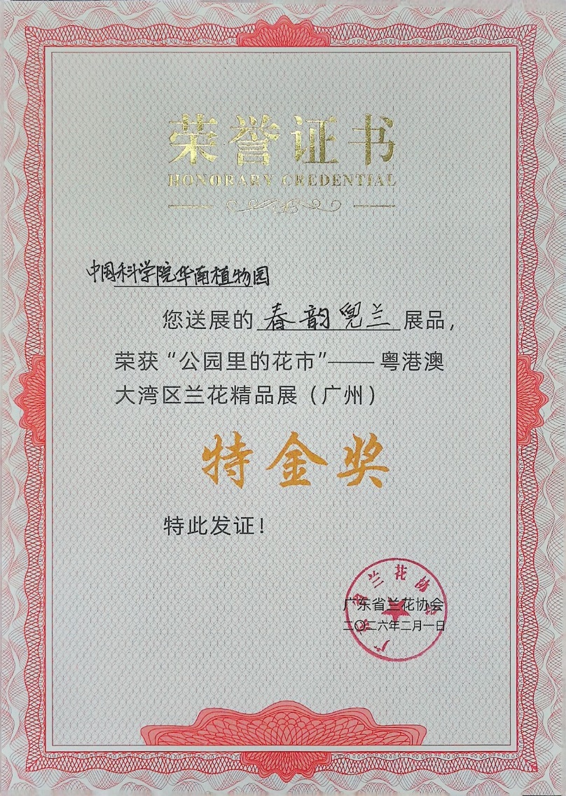 活动中千余个品种的兰花在兰圃竞秀,400多个品种参与花卉精品评奖,华南植物园曾宋君研究员团队育成的兜兰新品牌共获得5个大奖,其中春韵兜兰获得最高奖特金奖,至尊兜兰获得金奖。